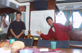 Then, before every dive, we were given an additional briefing on the dive site, which included a sketch of the dive site, details as to what interesting fish and/or coral might be seen there, as well as a proposed dive plan. Every dive was given a 70 minute limit, returning with 50 bar of air. This is more than enough for any recreational diving. Most of us averaged dives between 45 and 60 minutes. Additionally, one or both of the dive masters was usually available for a guided tour of the dive site (this would depend, I would guess, on whether anyone on the boat is doing a dive course.) The dive crew also stressed good reef ecology at the beginning, in the middle, and at the end. I was happy to hear this, even though I felt that all of us guests had a pretty good idea of what to do and what not to do anyway. When we did encounter some dwarf minke whales on the second and third mornings, we were given another briefing about the minke whales, what to do, what not to do. |
