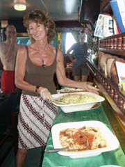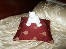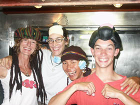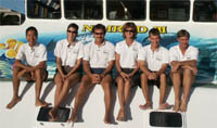 Petra was the hostess. She was in charge of keeping the place looking good, waking us up cheerfully every morning at 6:30 am (knock, knock, Wakey! Wakey! Time to dive!), and provide for any other little things not taken care of by the dive crew or the chef. She did a great job, especially with the little things. Two things of note were that the first night I found that my pillow was much too thick for my liking (sounds picky, I know), and I asked for a thinner one. She got one for me right away. The second was cuter. I always travel with a little bear (Mei), and every day when she made the beds, Petra would put Mei on top of one of the little pillows on the bed, making the bear look very regal. It always put a smile on my face when I walked into the room. All the big things (cleanliness, etc.) were taken care of so well, it was the little things that were also taken care of that got my attention (and yes, the first sheet of the toilet paper got folded over every day.) Overall, the personality and integration of the crew was great. We were a relaxed bunch of guests, and they relaxed around us, and provided quite a bit of amusement, as the picture of them in the silly hats shows. |