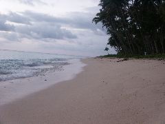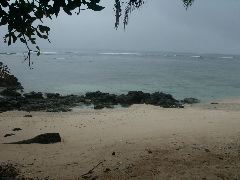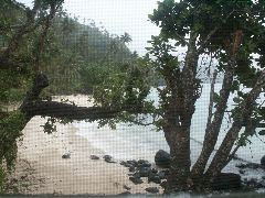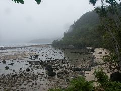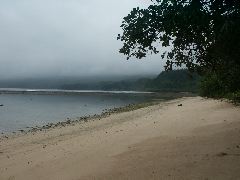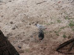 White sand beach at Lavena Lodge |  Don't normally expect to see chickens on the beach |  A grey, but warm day |