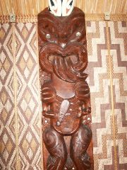 View out to islands |  War canoe in Waitangi |  (*) Carving in Marae in Waitangi |